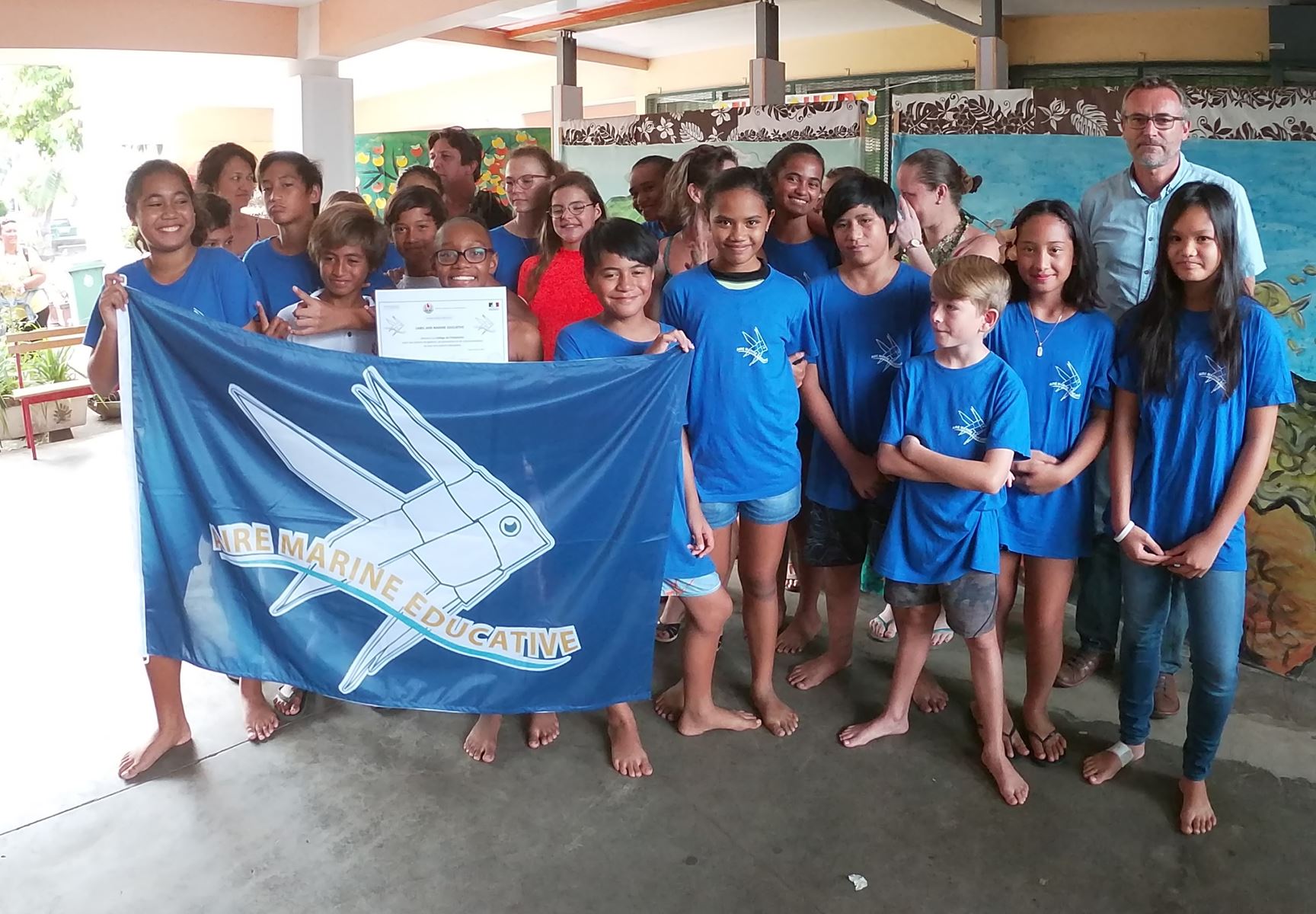 Candidats au Label AME 2019, les élèves de la classe de 6e 4 du collège de Punaauia, accompagnés de leurs professeurs de SVT, Français et Histoire-Géographie, Mesdames MOURIERRAS, TEHEIURA et LAYRLE ont été invitées pour l’occasion. Ils ont reçu leur récompense des mains des 2 experts AME, pour leurs travaux réalisés dans la gestion partagée de l’AME avec leurs collègues de 2+2=4. Ils font désormais partie de la Génération 4 du Réseau des Aires Marines Educatives de Polynésie.