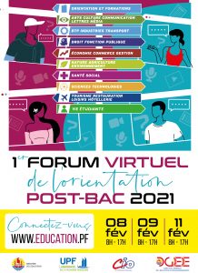 Dans cet objectif, le premier Forum de l’Orientation post-bac virtuel en Polynésie française présidé par le Ministère de l’éducation, de la modernisation de l’administration, en charge du numérique, en partenariat avec l’UPF, se déroulera les 8, 9 et 11 février 2021, de 08 h à 17 h.